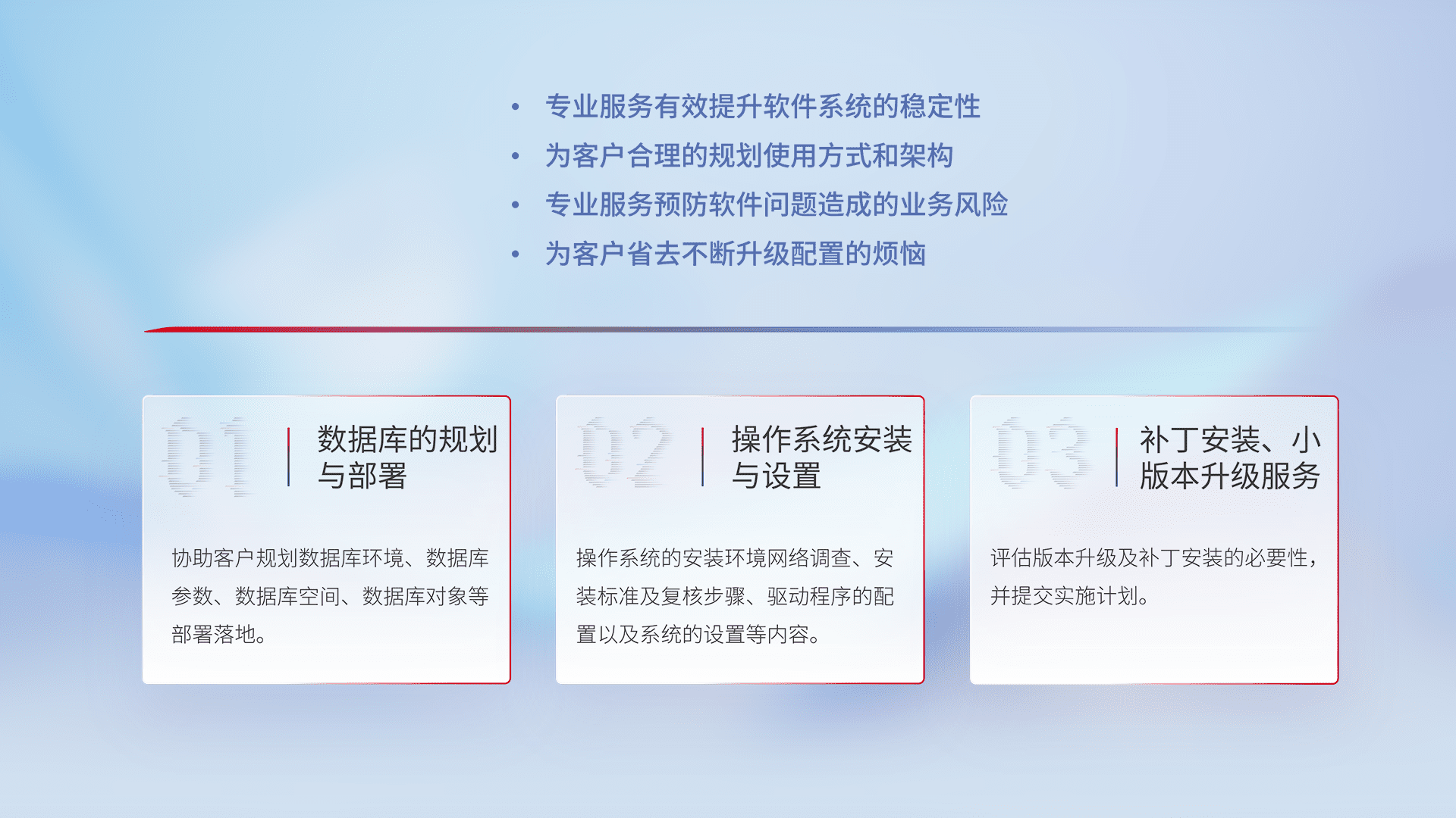 为客户提供软件规模升级、、、、快速部署、、按需配置的专业服务,,,从数据库的规划与部署到操作系统的安装与设置,,再到补丁安装和小版本升级提供支持。。