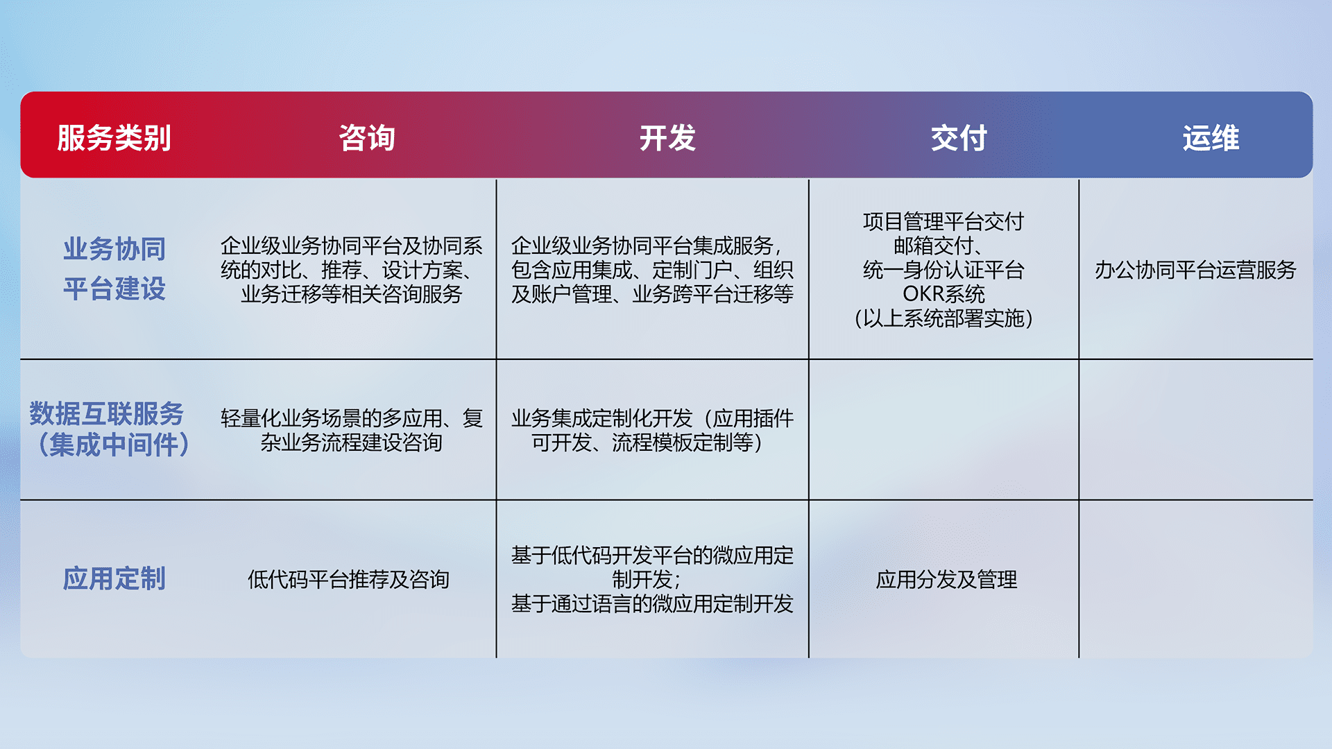 针对钉钉、、企微、、IDaas等平台级产品提供产品的规划、、方案、、、、交付、、、、定制化开发等服务,,,,实现如统一协同办公、、、智能客户服务、、、混合会议管理、、、、智能数据查询、、等业务场景,,,,实现数字化转型。。